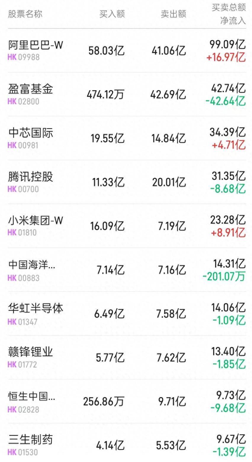 北水净买入最多的个股是阿里巴巴-W(09988)、小米集团-W(01810)、华虹半导体(01347)。北水净卖出最多的个股是盈富基金(02800)、恒生中国企业(02828)、腾讯(00700)。